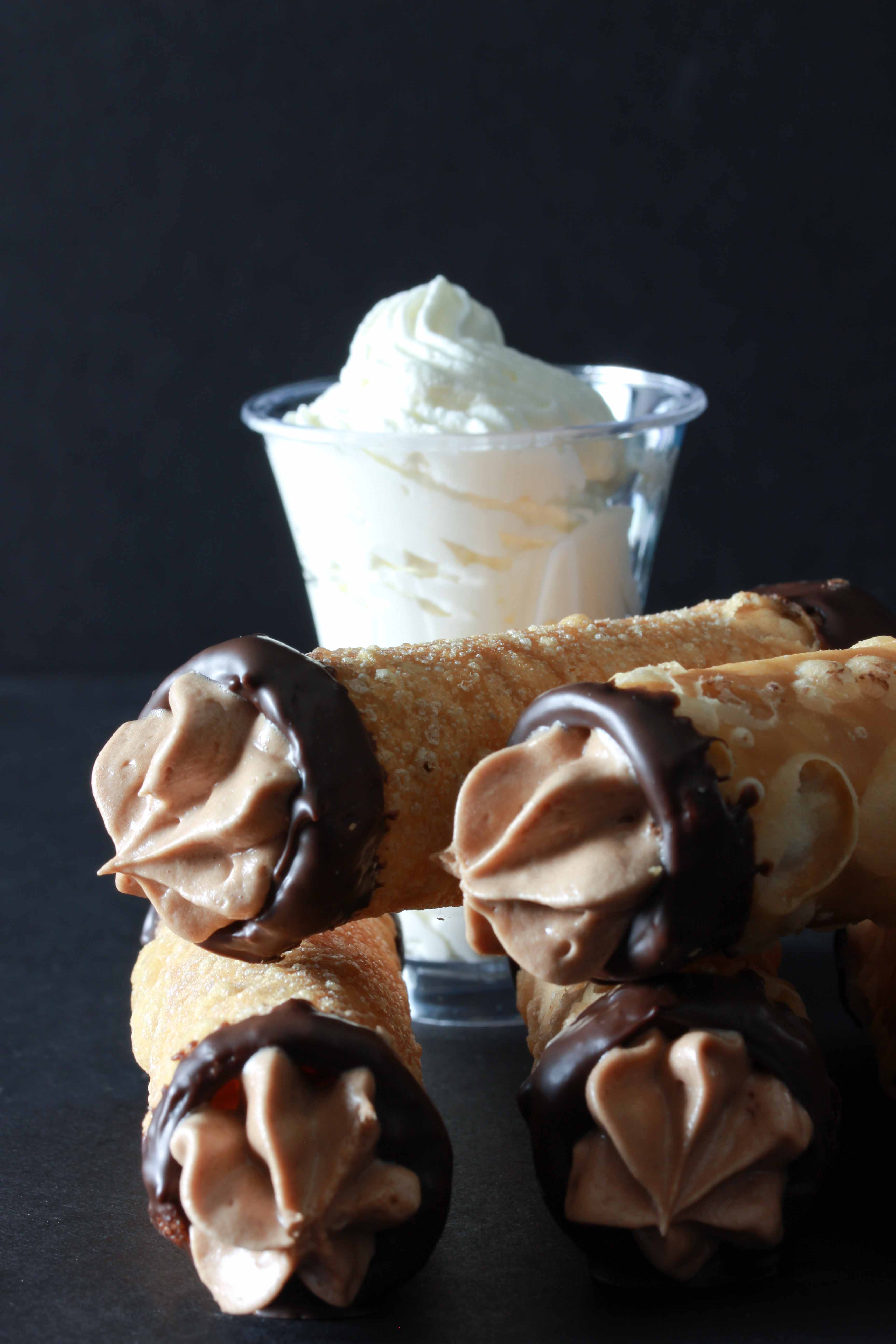 Now let’s talk filling. I have made “cannoli” in the past (using store bought wafer “shells” and filled them with lightly sweetened whipped cream. But this time I decided to take things a step further. I made the most amazing mousse filling for these. I don’t know that there are adequate words in the English language to describe this filling, so make it and you will see what I am talking about.