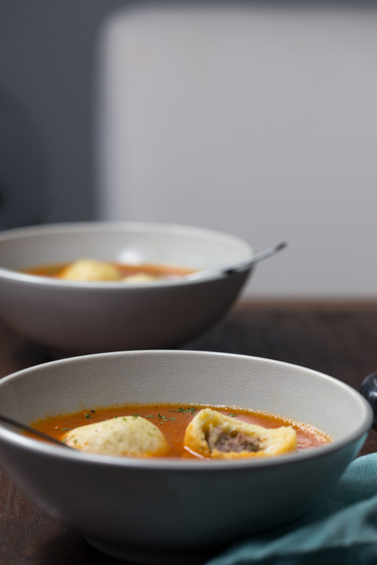 Meatball Stuffed Matzo Balls in Creamy Tomato Soup (freeze matzo balls and soup separately)