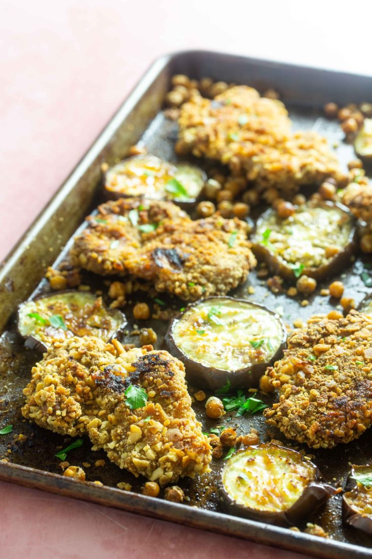 - Place chicken around the eggplant and chickpeas on prepared baking sheet. (Use two baking sheets, as needed, to ensure nothing overlaps.) Drizzle olive oil and honey over pan.
